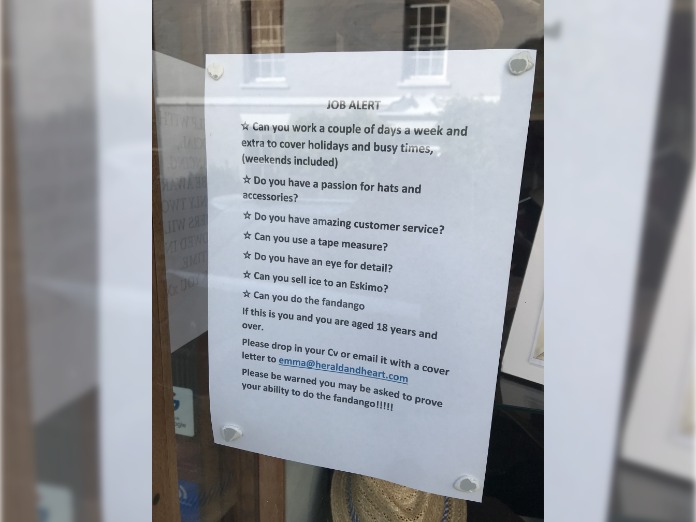 So nice to see something a little light hearted and tongue in cheek in among all the Covid-19 related signage and if you fancy applying, as the poster says, drop your CV in to the shop or send an email to emma@heraldandheart.com.
