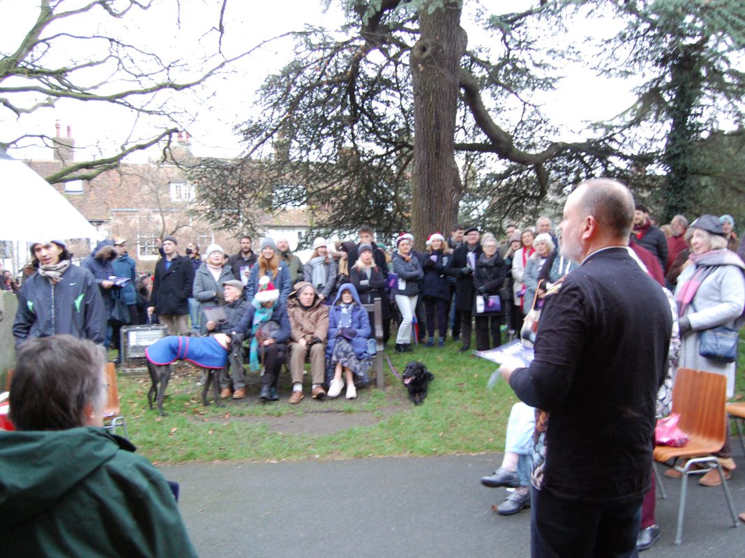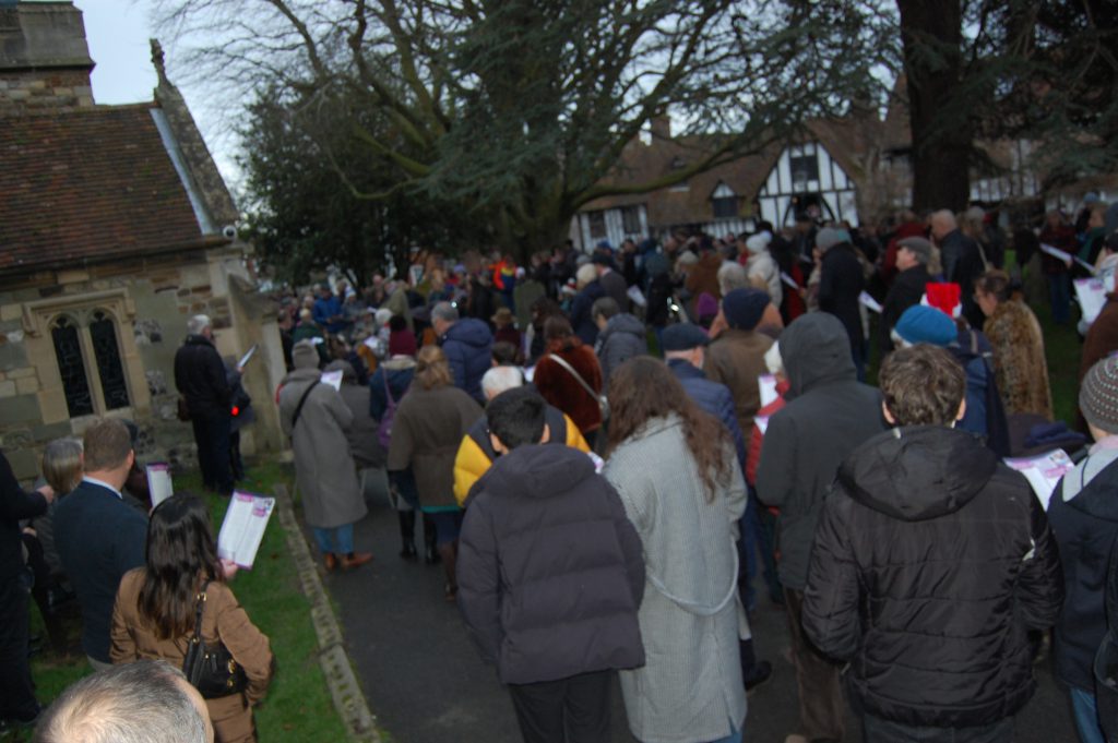 Upwards of 100 people gathered around the south door in St Mary’s churchyard on Christmas Eve. They were there to sing carols or to hear them sung, for not all those present appeared to be raising their voice. It was a time for goodwill and for many to welcome Paul White, the new rector, who led the singing.