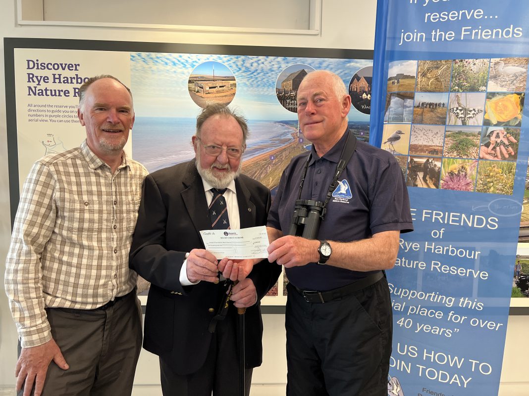 Freemasons are a charitable organisation which raises funds for deserving causes, but during the Covid lock-down visits to present donations and cheques were put on hold. Brian was given the task of delivering a cheque on Wednesday May 4 to the Chairman of the Friends of Rye Harbour Nature Reserve, Cliff Dean.