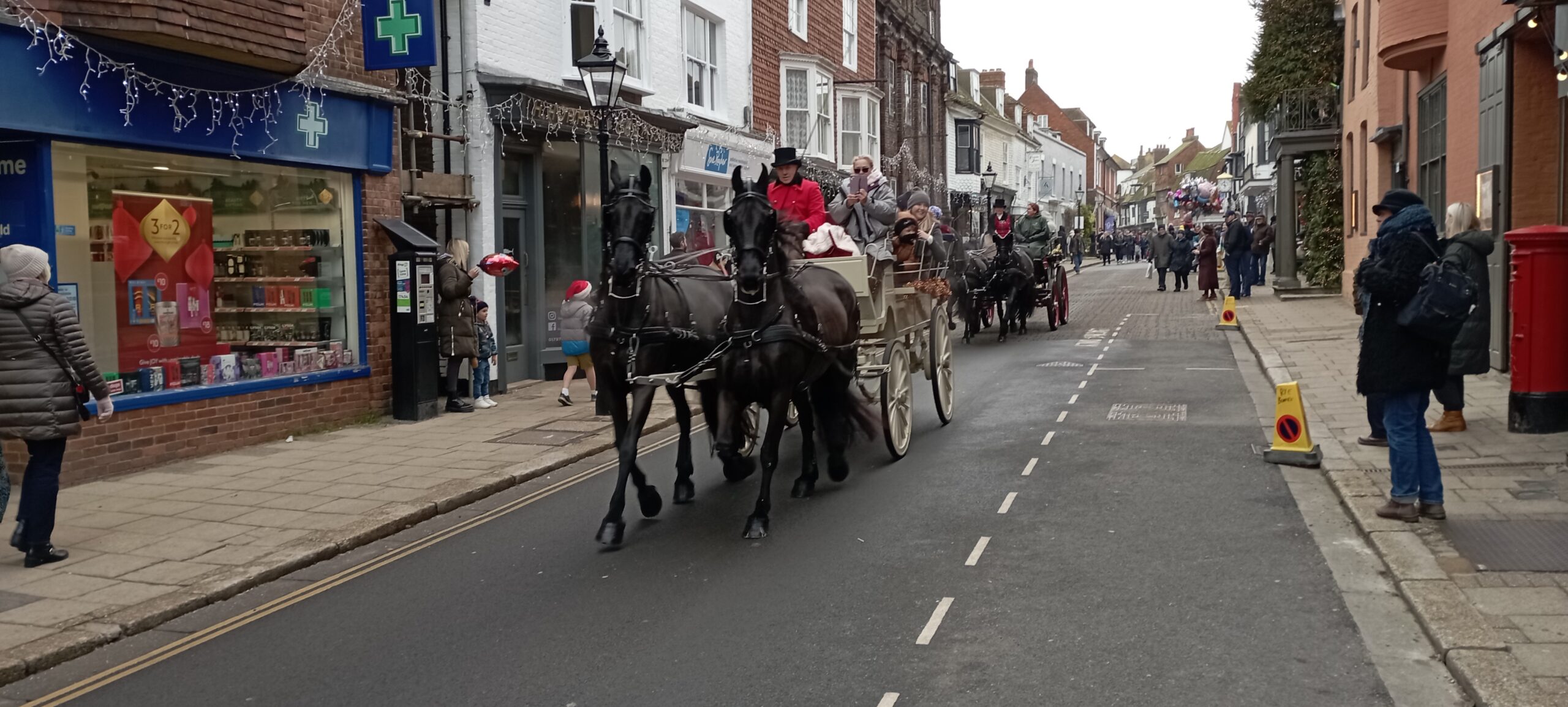 Last Saturday, December 2 was definitely one of the highlights of the Rye calendar year, the day the town put on a spectacular Christmas Festival which attracted locals and visitors from far afield, thanks to Sophie Judge and her team of volunteers who worked so hard to make this such an inclusive and fun day to remember. Pedestrianizing the High Street allowed visiting families to relax as they walked freely along the road sampling the delights of what was on offer, shared by the horse and carriage rides which ran throughout the day.