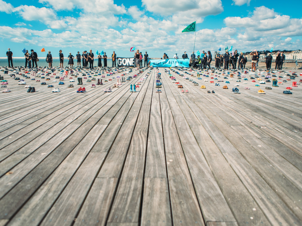 On Saturday, July 11 I attended an event organised by Extinction Rebellion Hastings and St Leonards and the performance was entitled GONE. It was a temporary installation of 1,200 pairs of children’s shoes on Hastings pier.