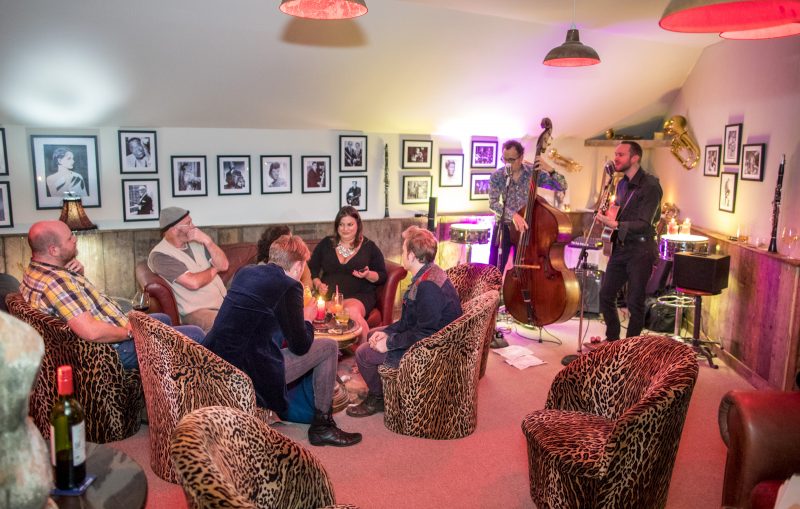 There is a bar as you enter and going up the stairs to the first floor a second, which serves the lounge. A pleasant surprise, it is tastefully decorated with many pictures of past actors in black and white, atmospherically lit, large enough to take up to fifty people and very appealing with its different sized seating areas, as well as having enough floor space if required, for dancing. That evening a jazz duo entertained us, “The Violet Jive”. They describe their music as a retro swing and Latin sound with a twist.