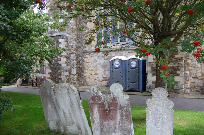 Judging by the comments we have heard, the installation of portaloos in St Mary’s churchyard has not met with universal acclaim. “Totally inappropriate”, said one; “why couldn’t they put it in Lamb House garden”, said another, “there’s plenty of room in the vegetable patch”. “It’s caused quite a ‘harumph’ in Church Square” said a third person. “Sacrilege”, muttered a fourth, a view evidently not shared by Canon David Frost who gave his permission.