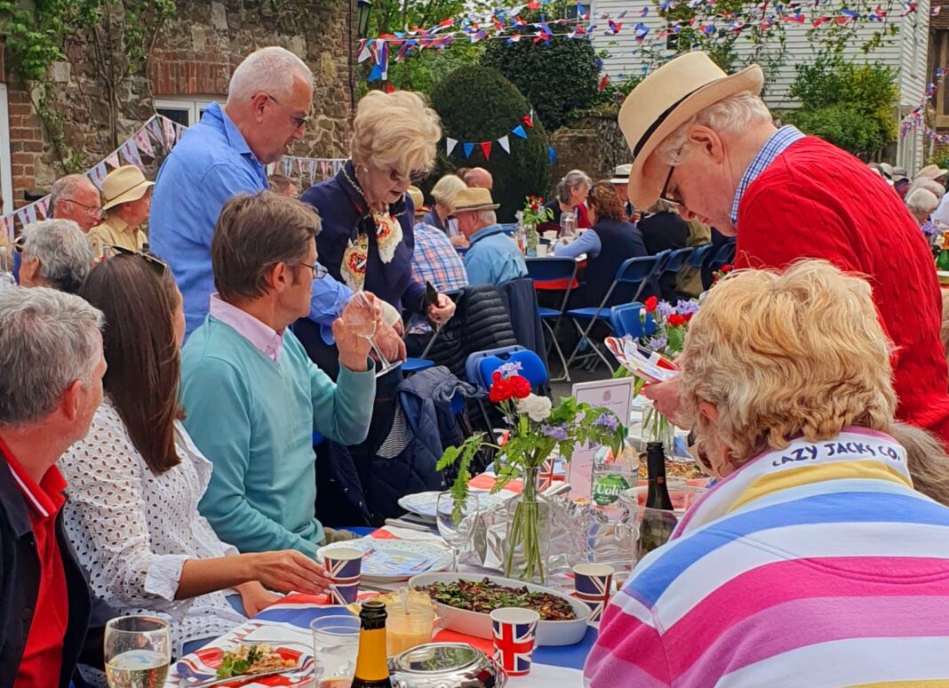 And so on Sunday, May 7, we held a huge street party, to mark the coronation of His Majesty King Charles III. We started with 120; this was dictated pretty much by the number of tables and chairs available from the New Hall. And then it went up, so we requisitioned tables and chairs from St Thomas’. And then it went up, so we raided the Court Hall. We finished at around 225, plus picnickers on the verge.