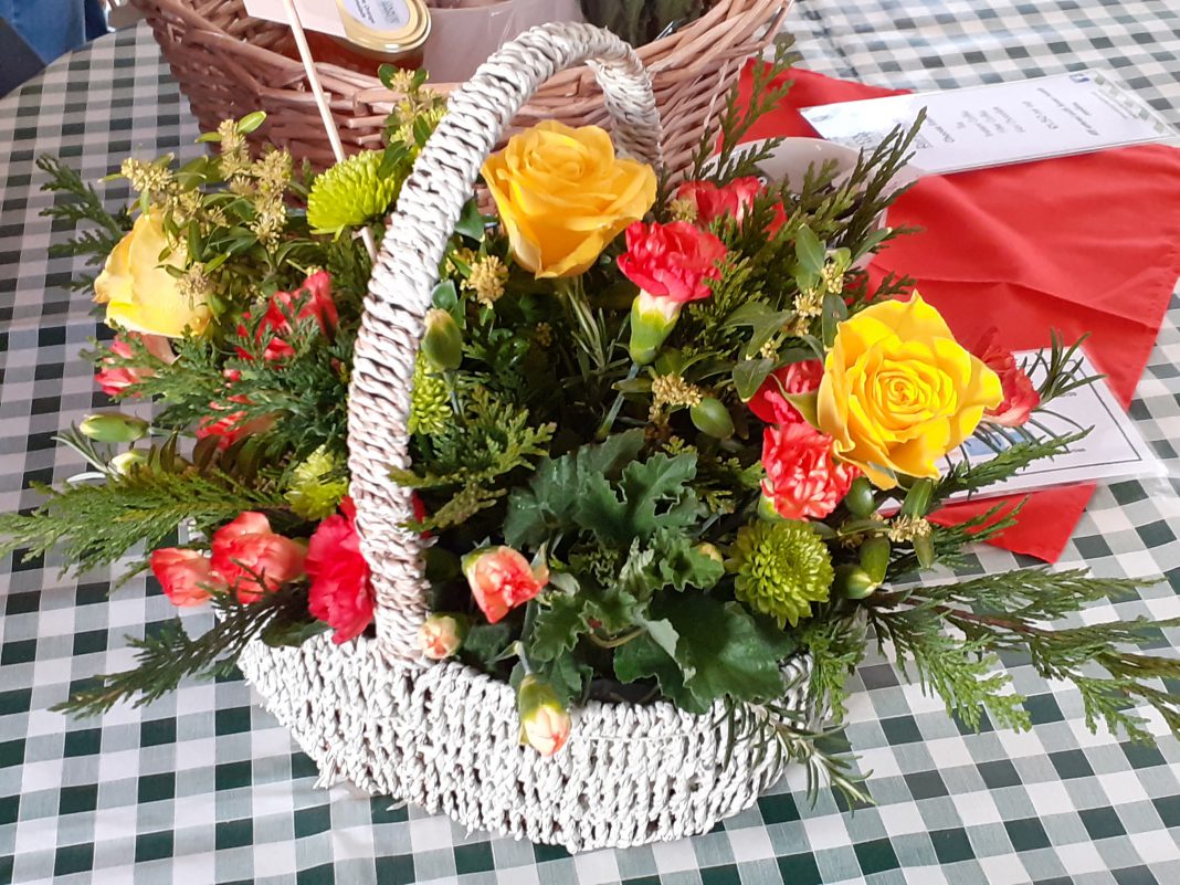 Once inside, the usual dash is for the fresh vegetables, but there were few to be had this early in the year. There were dairy products though and goose eggs, a particular favourite in our family. There were spring flowers too, mostly daffodils, but I bought a lovely woven basket made up by Marie Ballard, containing roses, carnations and chrysanthemums – irresistible!