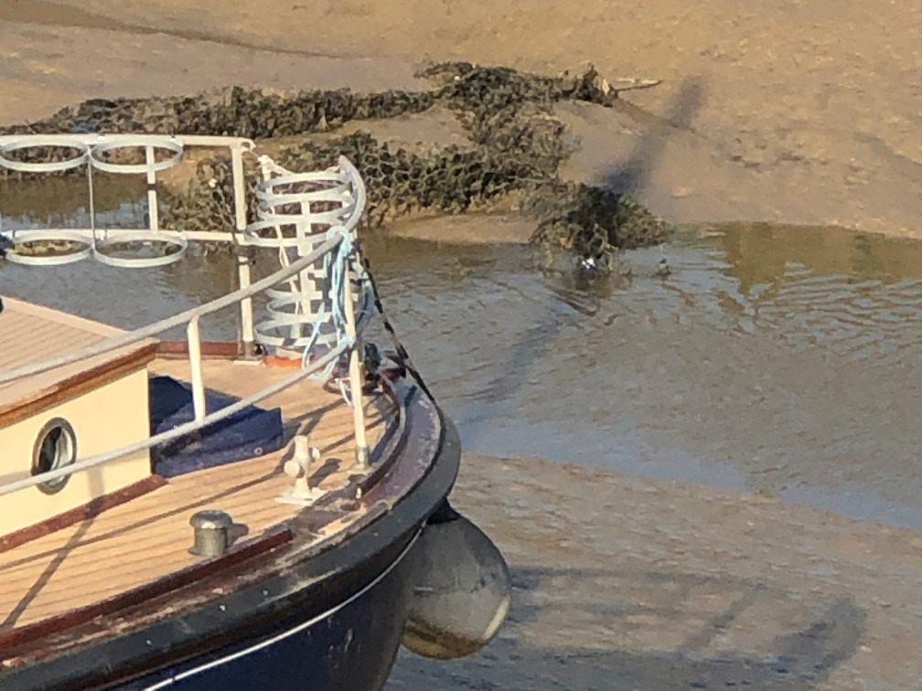 The danger is that the netting and accumulated weed could foul and snare a boat’s propeller but, at present, as the netting cannot float and is at low tide level, it should not present a problem to boats moving in or out at high tide.