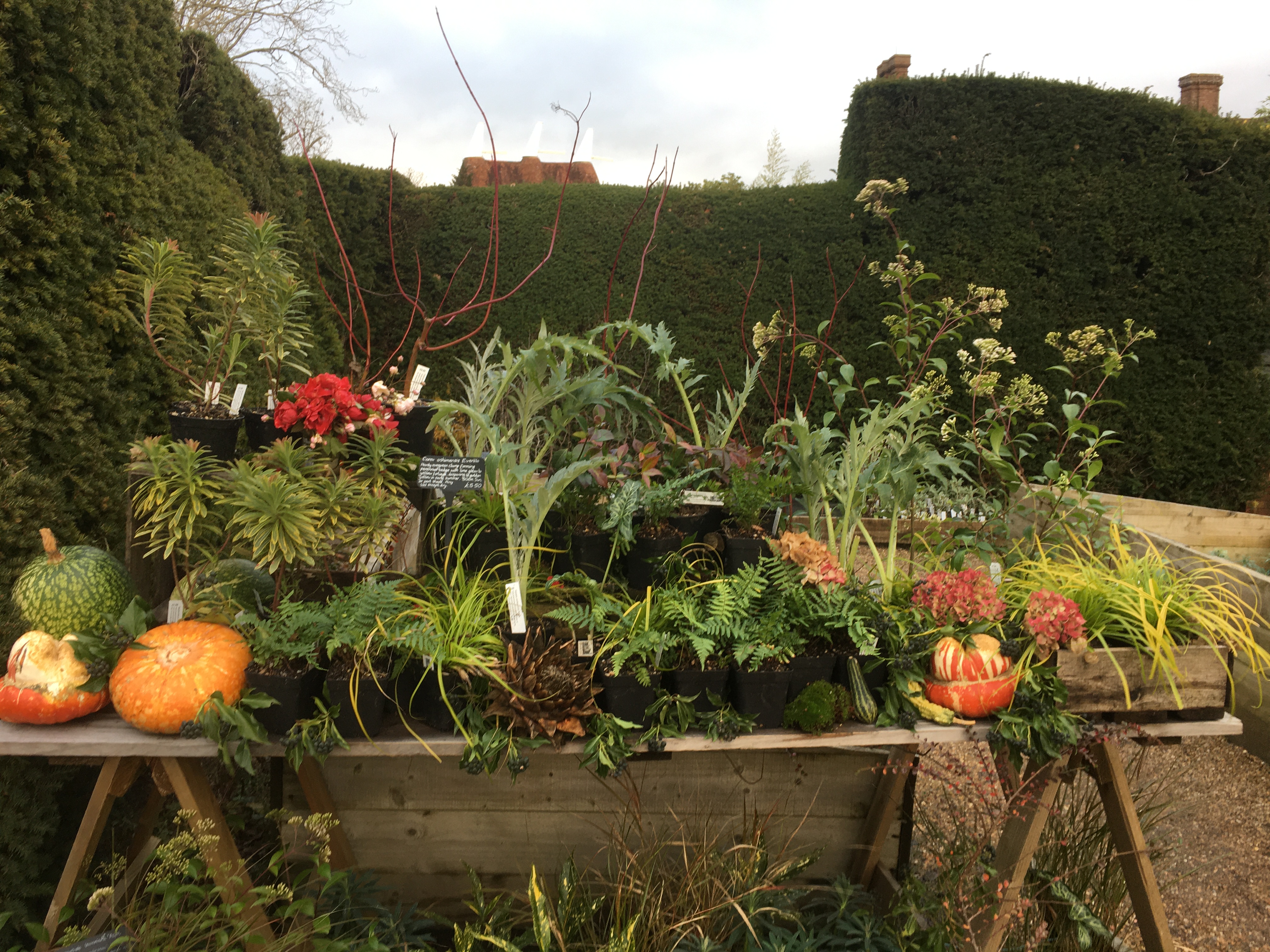 There were quite a number of different stalls, some familiar and some less so from past years. The cart shed had beautiful Christmas arrangements and refurbished tools, a garden fork one of my purchases, and the hovel, a building in between the still flourishing exotic garden and the topiary lawn, housed the handmade candles and some beautiful French pottery.