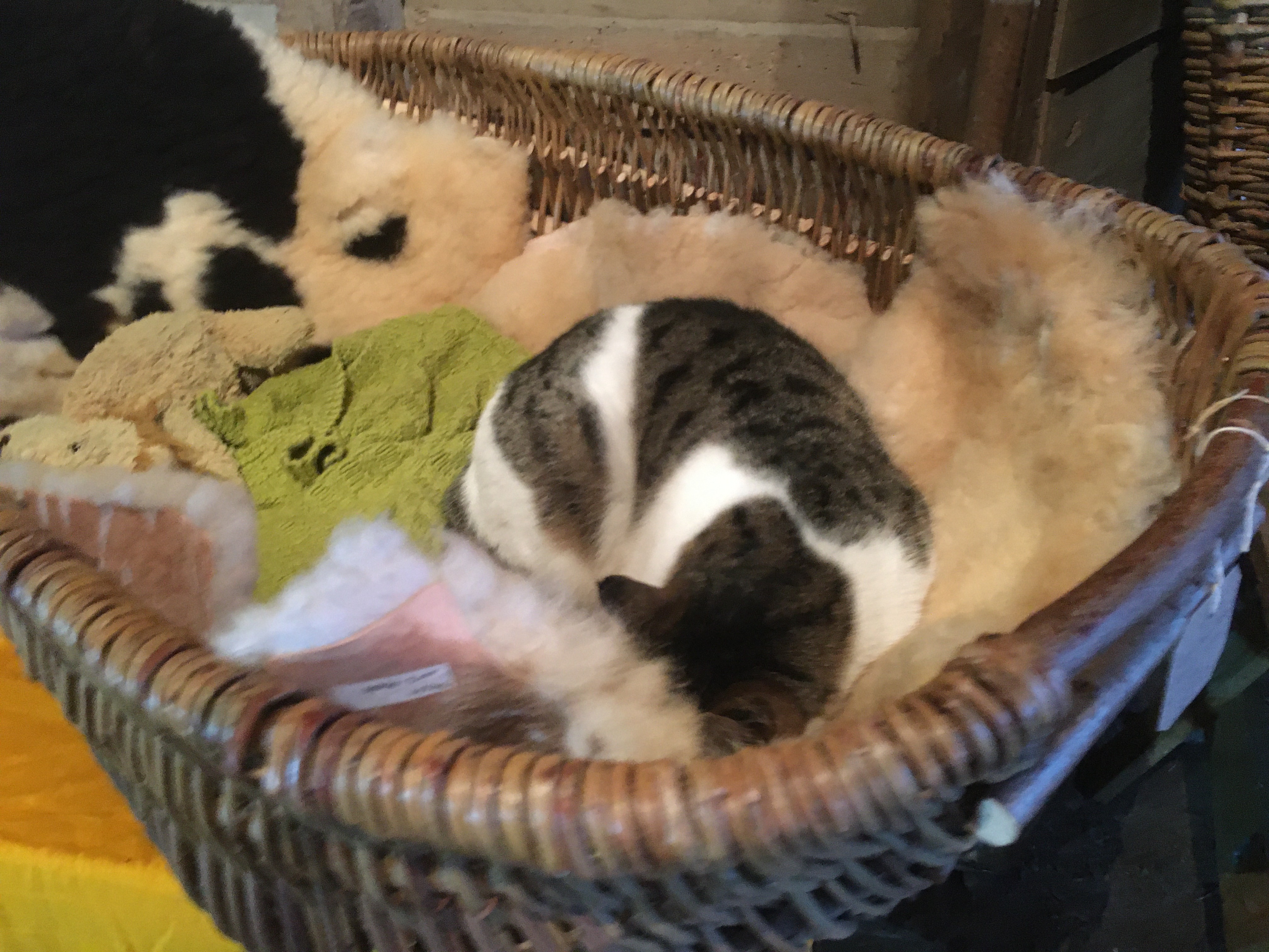 The entrance had the willow weaver, and one of the cats that live around the nursery and kiosk was firmly curled up in one of them (see photos below). So comfy. The baskets were absolutely lovely, and there were also willow balls and shapes to enhance any garden.