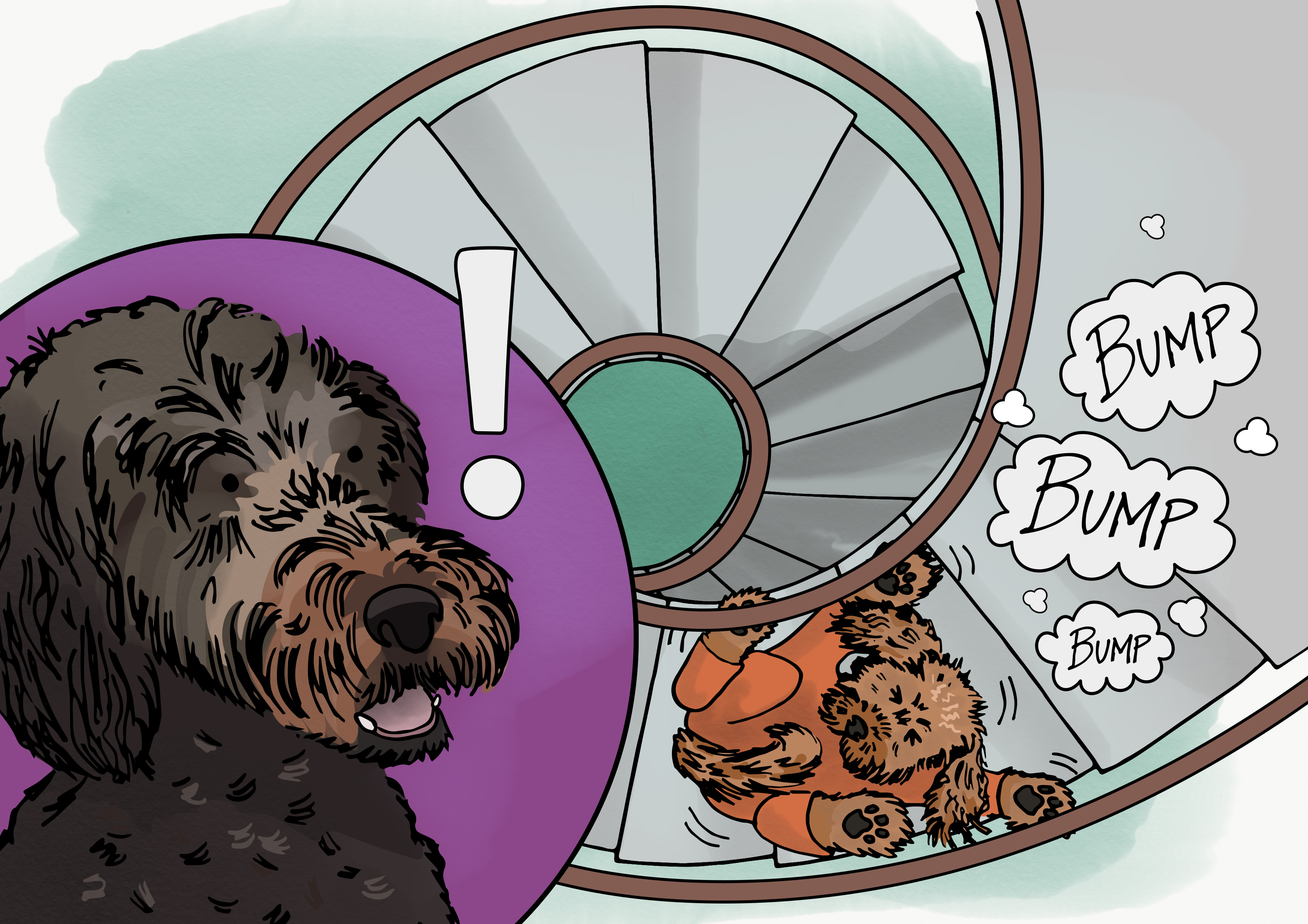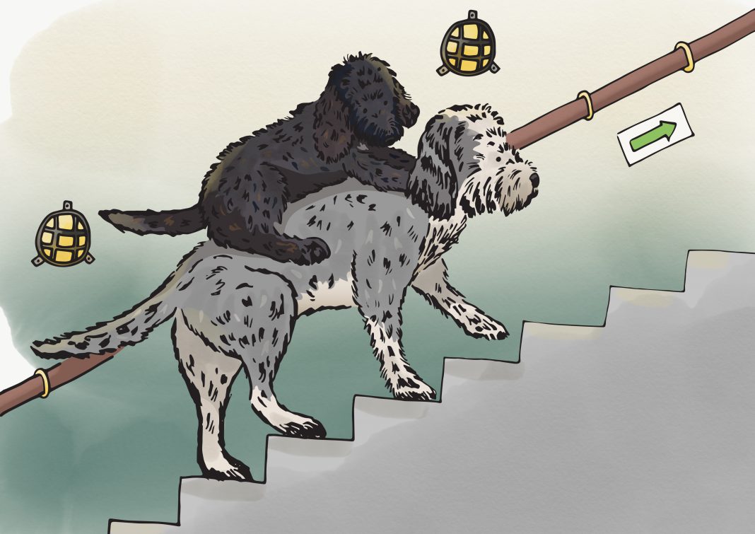 When the others were almost half way up, Dante and Phoebe were still at the bottom, because they were having trouble climbing onto the first step. The steps were so tall and their legs so short that they couldn’t reach the top of the first step. After trying a couple of times Dante wondered if he could use his front paws to pull himself up, but sadly this didn’t work either. Every time he thought he was nearly there, he lost his grip and slid back down. After so many tries both he and Phoebe began to cry. They don’t like being left behind.