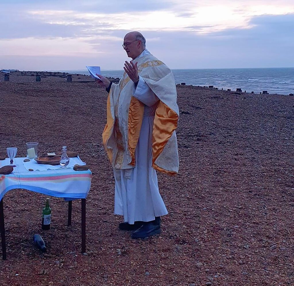 Jonathan explains, “For the last five years we have celebrated the first communion of Easter on the beach at Winchelsea. This year for the first time we celebrated at Pett Level near to our chapel of Saint Nicholas.