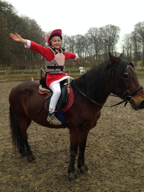 Arriving through the woods on horseback along with his elf helper (the reindeer were being rested before their round-the-world trip two days later, and was Santa looking just a little nervous on his unaccustomed transport?), he surprised children at the stable’s annual Christmas pony party with many of them, as our picture shows, dressed for the part.