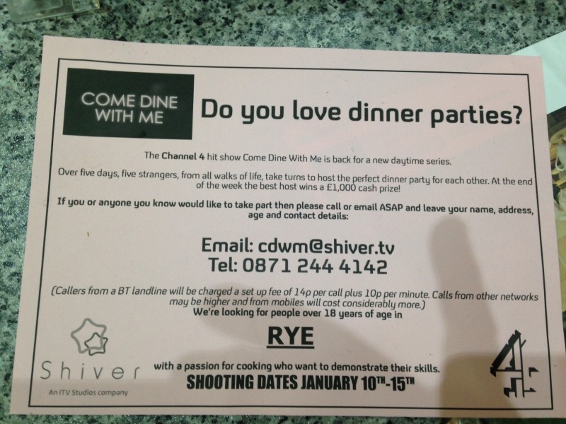 Channel 4’s “Come Dine with Me” is looking for contestants for a series set in Rye and Hastings to be filmed January 10-15. If you are over 18 and want to take part, call 0871 244 4142 or email cdwm@shiver.tv.