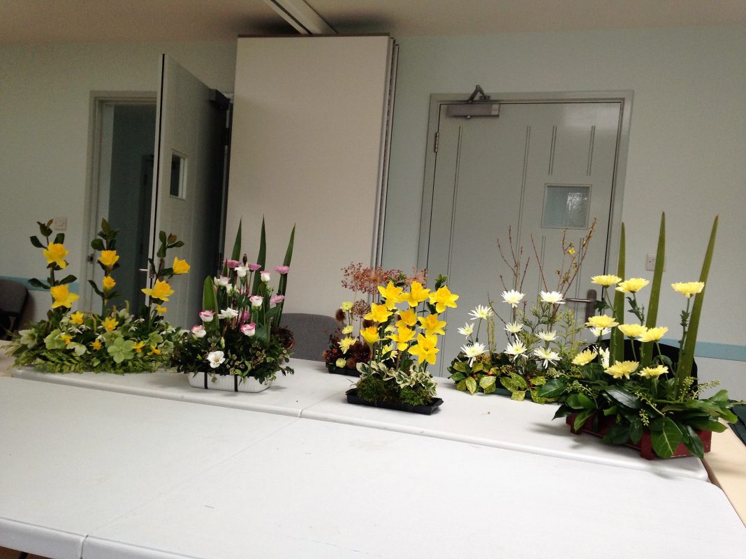 Each month there is a different theme, with Rhiannon demonstrating it at the end of the class. For example, in April we will be doing a water arrangement. All the themes are agreed in advance and a programme is provided. This morning, we were doing our best with parallel arrangements, very modern and surprisingly difficult to get right! Our various efforts are illustrated in the picture below, and the process we undertook to reach the final arrangements is also pictured.