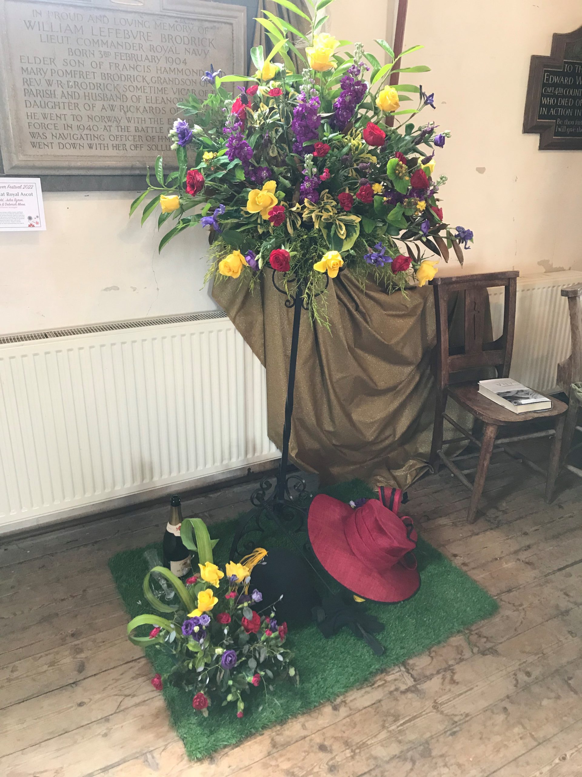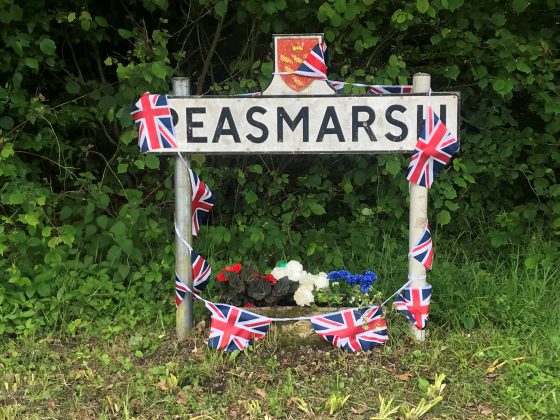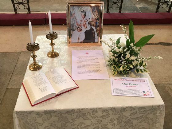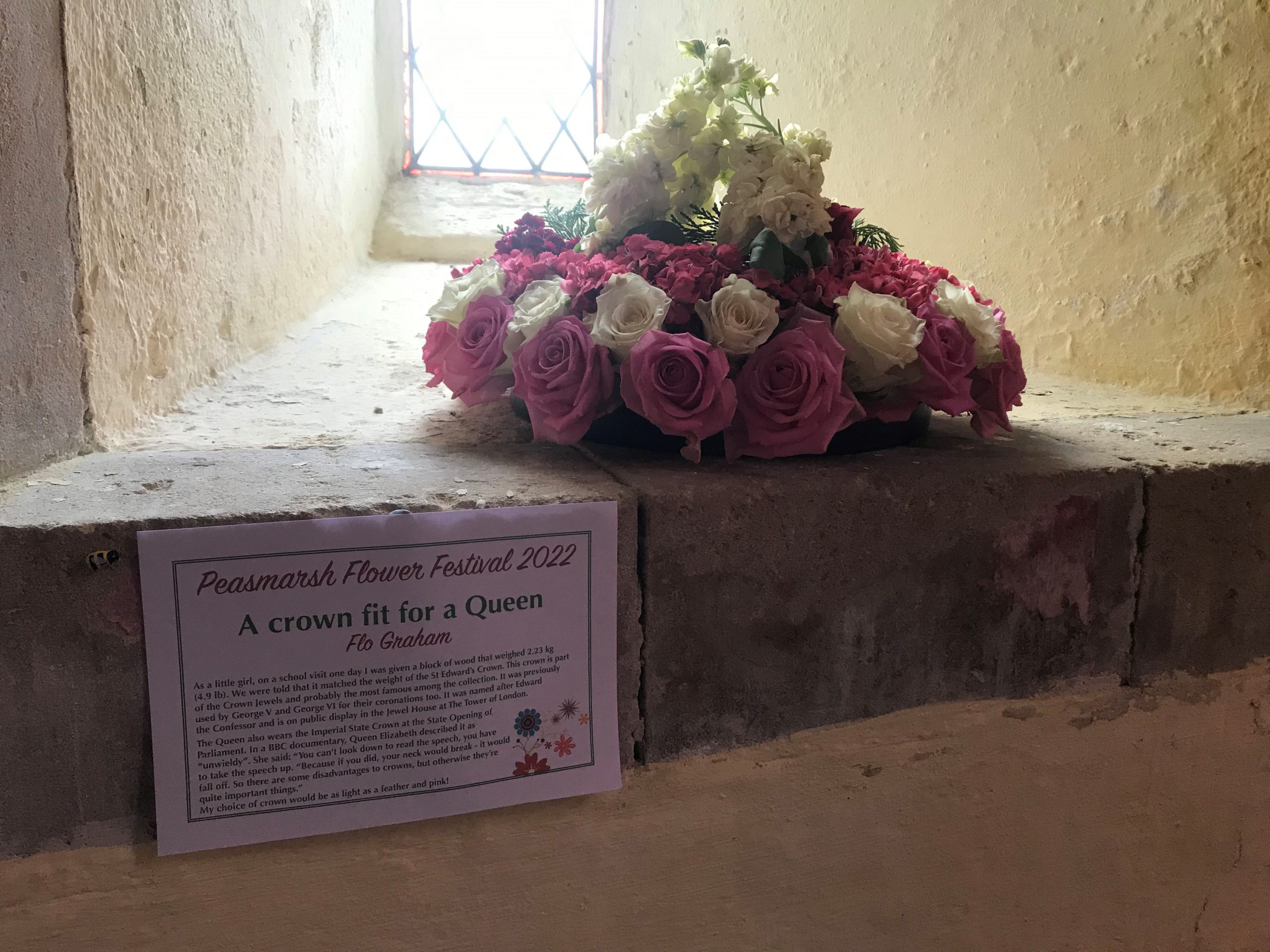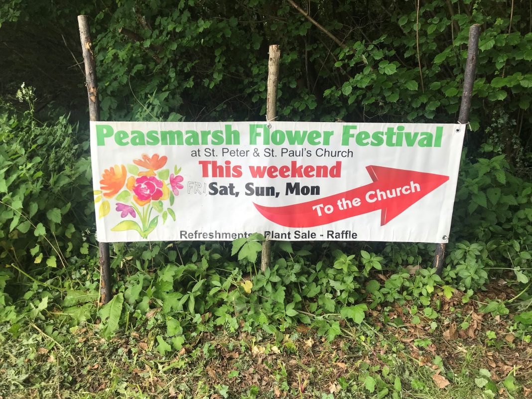I’ve often driven past the signs advertising the Peasmarsh Flower Festival -you can’t miss them with the fluorescent green and with the distinctive directional banners at the bottom of Church Lane. Even the Peasmarsh village sign has been embellished with a floral tribute to Her Majesty the Queen, whose 70th year on the throne we are celebrating this year, culminating in a four day weekend.