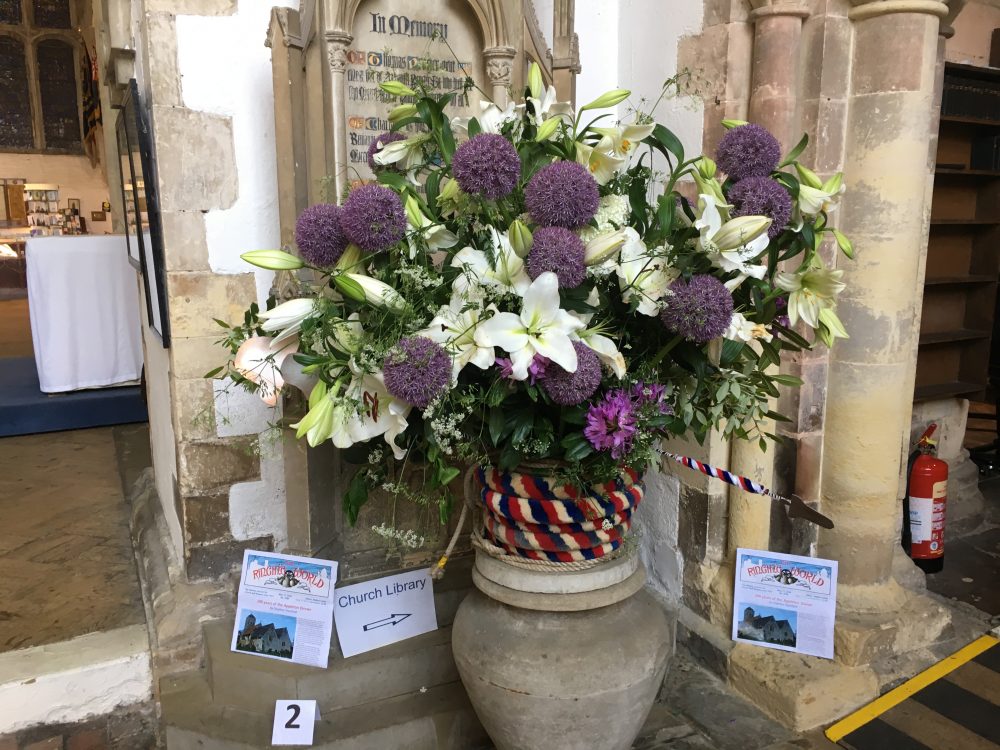 Moving on to the arrangements, at the entrance was a stunning display of white lilies and purple alliums with cow parsley , by St Mary’s bell ringers to celebrate the 200th anniversary of “three bells and a sance belle” in St Laurence, Appleton Church Tower, (near Abingdon, OX13 5JS,) Society of Change Ringers.