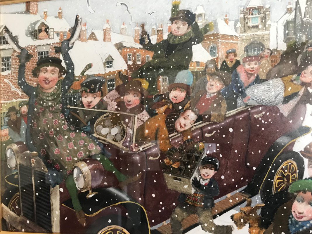 One of Rye’s favourite artists, Richard Adams, may provide the answer to your dilemma for he has been designing Christmas cards over the years in his own distinctive and humorous style and this years design ‘Christmas Charabanc’ ( see photo above) is soon to be available.