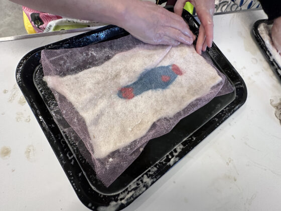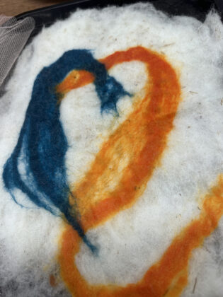 Amanda explained: “To create felt, the carded wool fibres are laid in several layers, criss-crossing each other, to make a structure which, when wetted with warm water and worked by hand to provide friction, using soap to aid the movement, will matt together to make a firm surface.