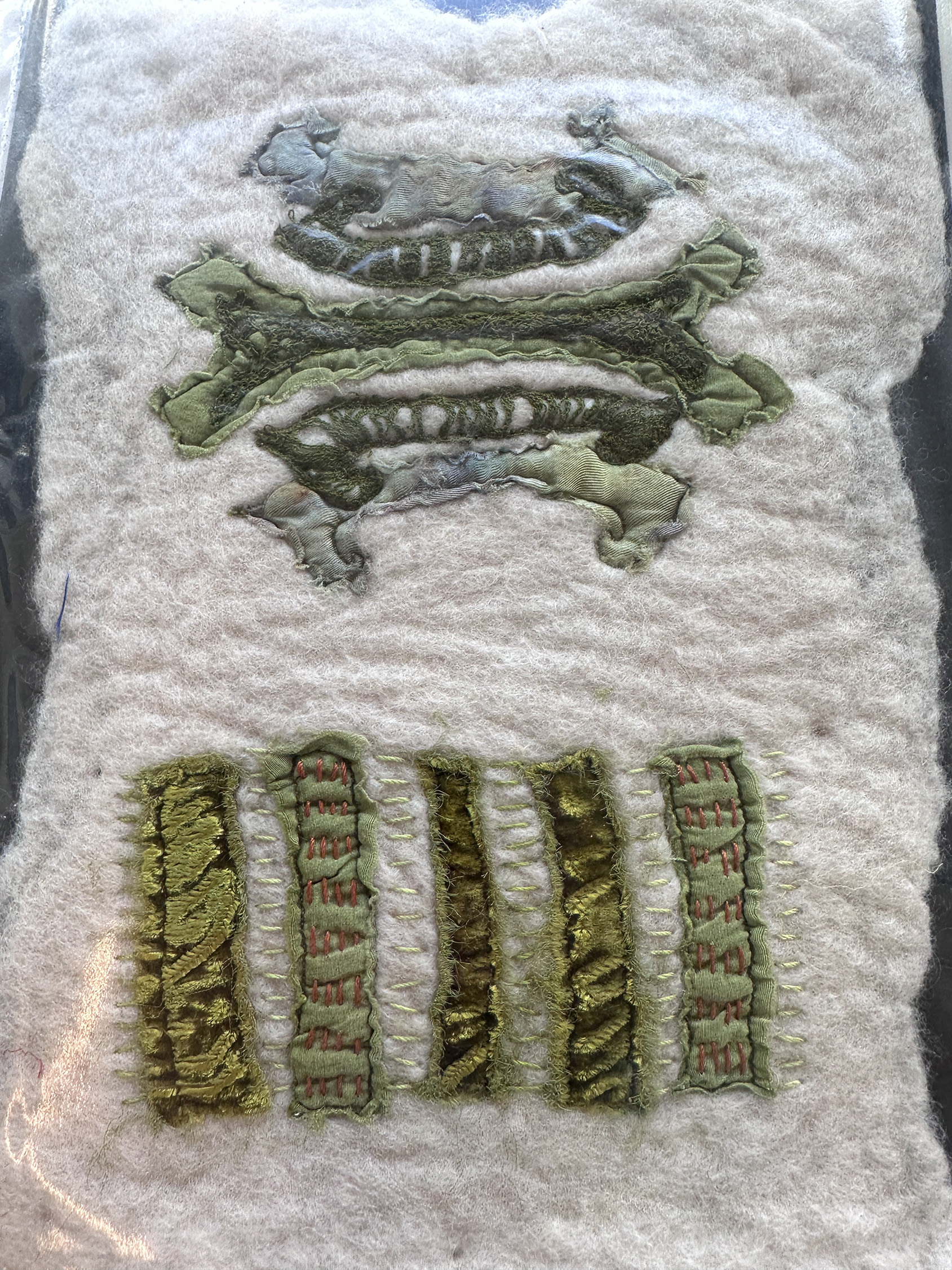Felting wool is the oldest type of textile art and although time-consuming it is very exciting to turn a pile of wool which looks rather grubby into something which is quite beautiful and creative. Anne Yates, who was also running the class, showed the group how she had embellished her piece of felt and made it into a pot cover.