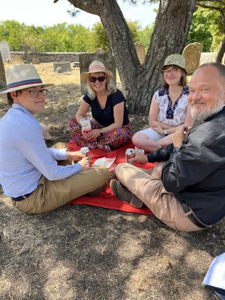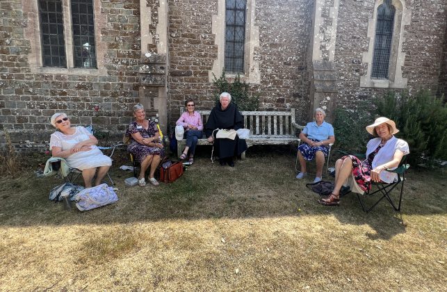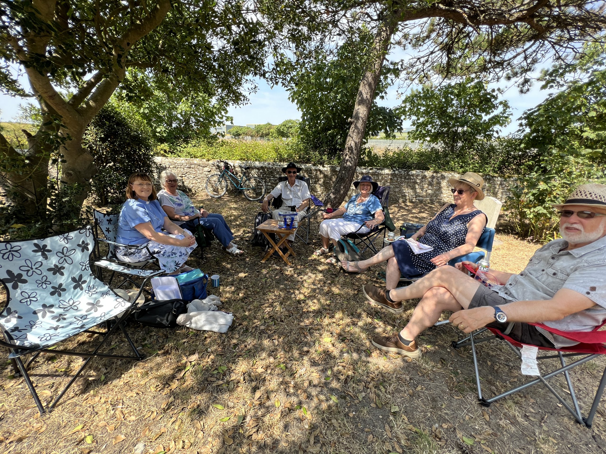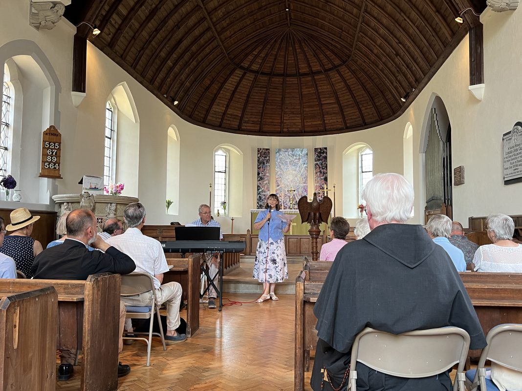 However, because of this year’s heat it was decided to picnic in the churchyard under the shade of the trees and hold the service in the harbour church, the Church of the Holy Spirit. This was very apt as the church was designed with a barrel-vaulted roof representing an upturned boat.