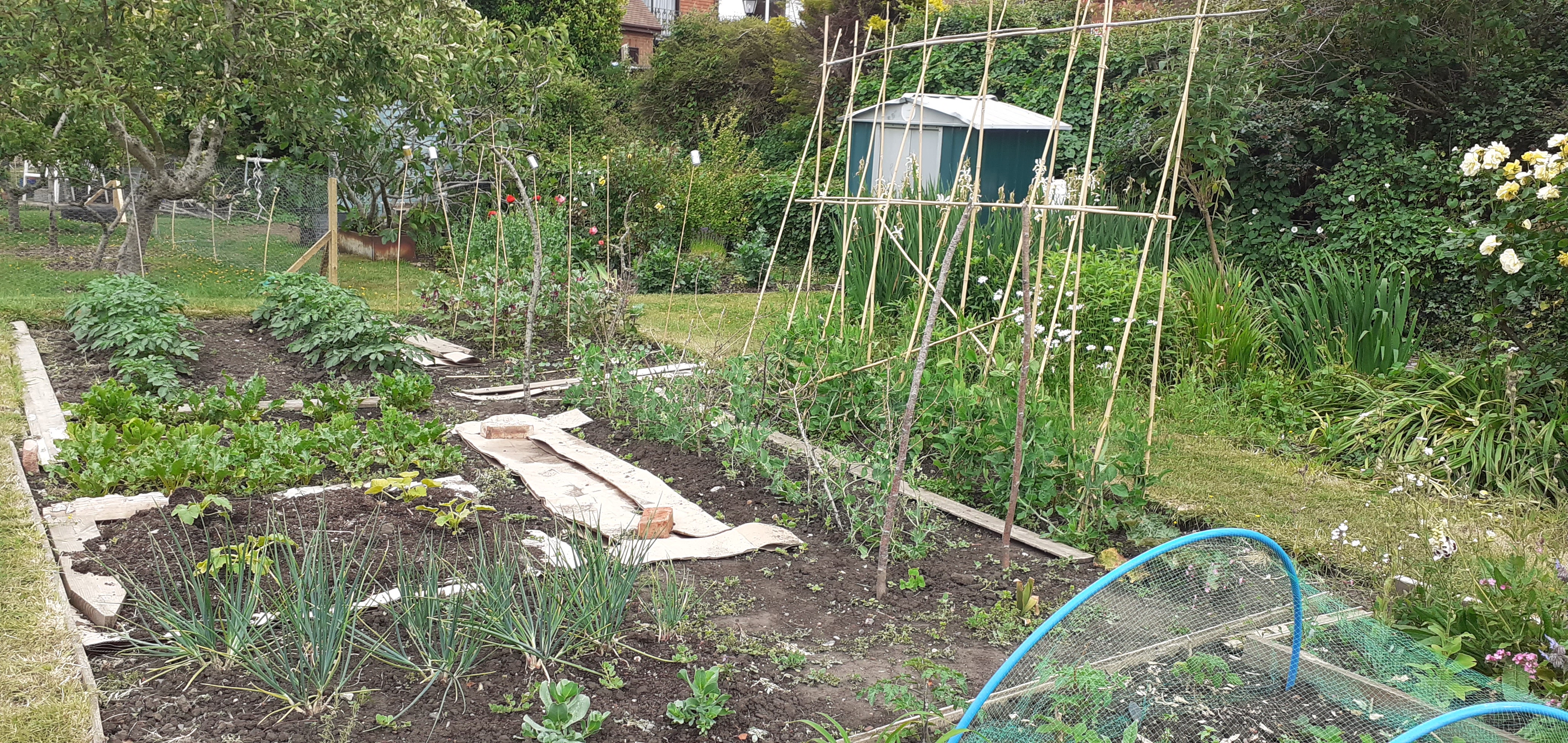 Two of us share the allotment and only started this year. The most tiring was the beginning, when it all needed digging over several times before planting. But once seeded, flowers, vegetables, strawberries and salad seemed to appear overnight. The hardest was watering as it needed several trips to the water butt, so we were very happy about the recent rain.