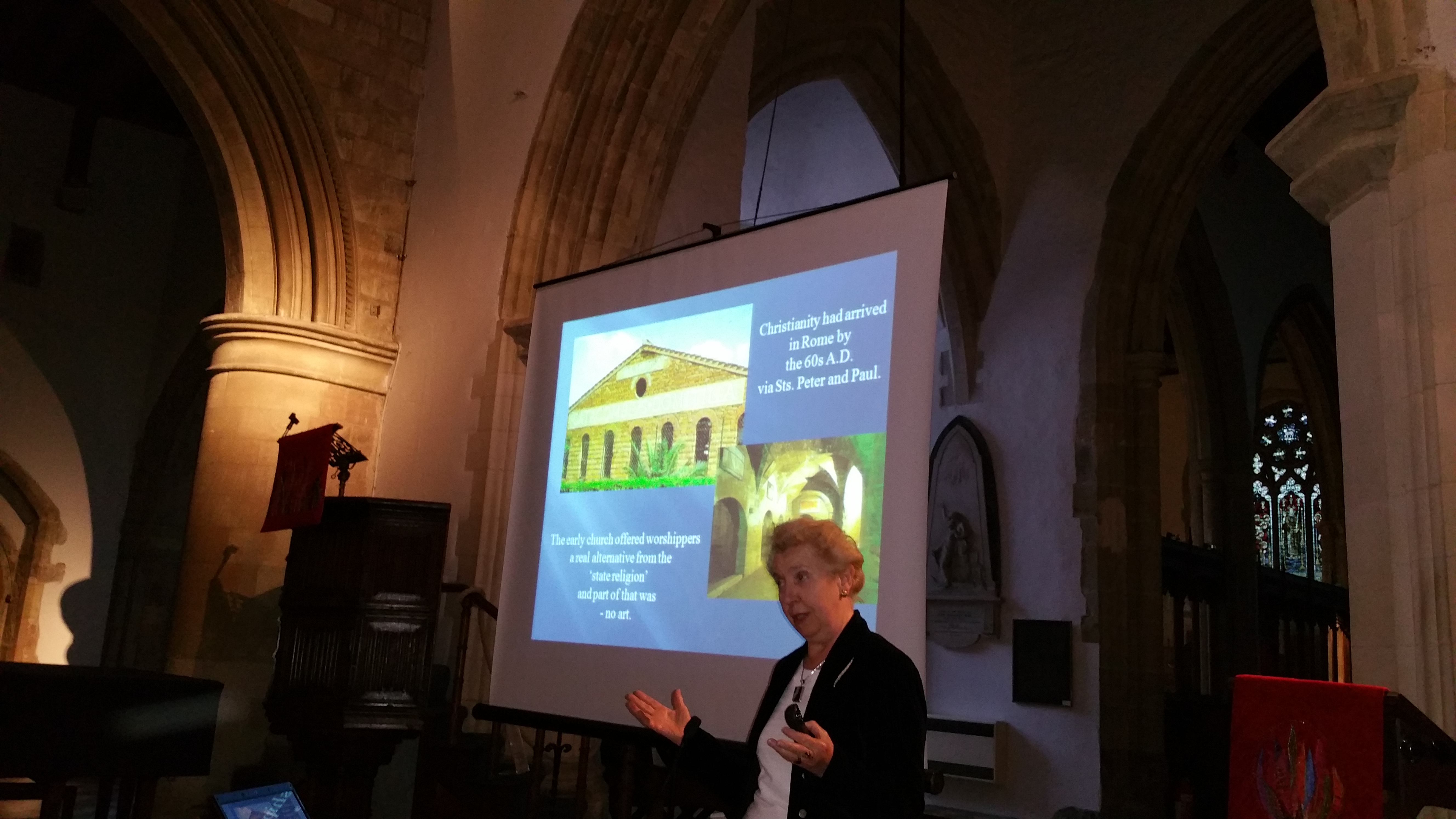 After the AGM, Dr Diana Matthews, pictured below and visiting from Reading, gave an illustrated talk on “Christian Art from Rome to Rembrandt”. This was an ambitious topic, which she handled expertly, covering a brief history of Christianity with key developments in art and sculpture.