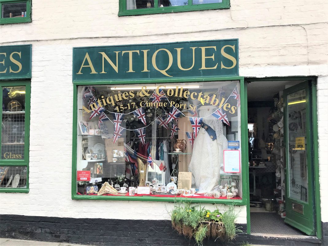 Wandering through Rye on Sunday we could see, as well as the many Union Jacks and patriotic bunting on display, our shops are also beginning to join in with some themed window displays. Rye Candy on the High Street have gone for a regal display with crowns, tea towels, posters, bunting and trays (see photo below) whilst on Cinque Ports Street, Needles Antiques have a lovely old fashioned display full of royal memorabilia, Union Jack bunting and a full wedding dress with regal sash – brilliant!