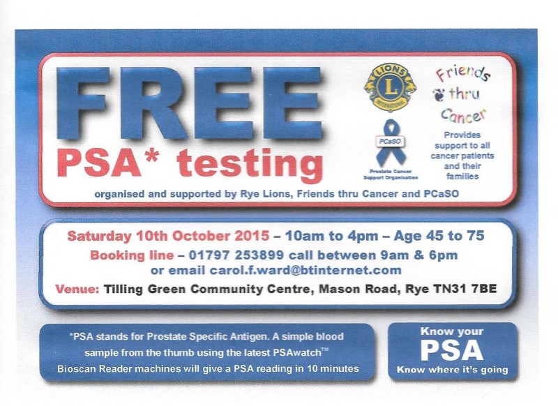 Rye & District Lions Club has arranged with the Prostate Cancer Support Organisation (PCaSO) to provide a free prostate specific antigen (PSA) blood test for men from Rye and nearby villages to assess their risk of any prostate problem, including prostate cancer.