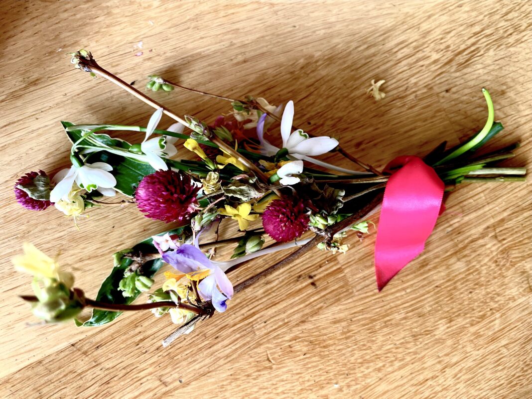 As we arrive for our lunch, Tamsin presents me with a tiny powerfully scented bouquet foraged from her garden. In medieval times, it was traditional to give friends a seasonal posy like this, a “tussie mussie”, as it was called, to ward off spirits. She likes to make her own version, gathering up wild and garden flowers, securing them with a bit of ribbon to create a modern posy with a double meaning… “We can choose to see it as a talisman” or, as she puts it: “Just a pretty thing to adorn your home on a grey day.”