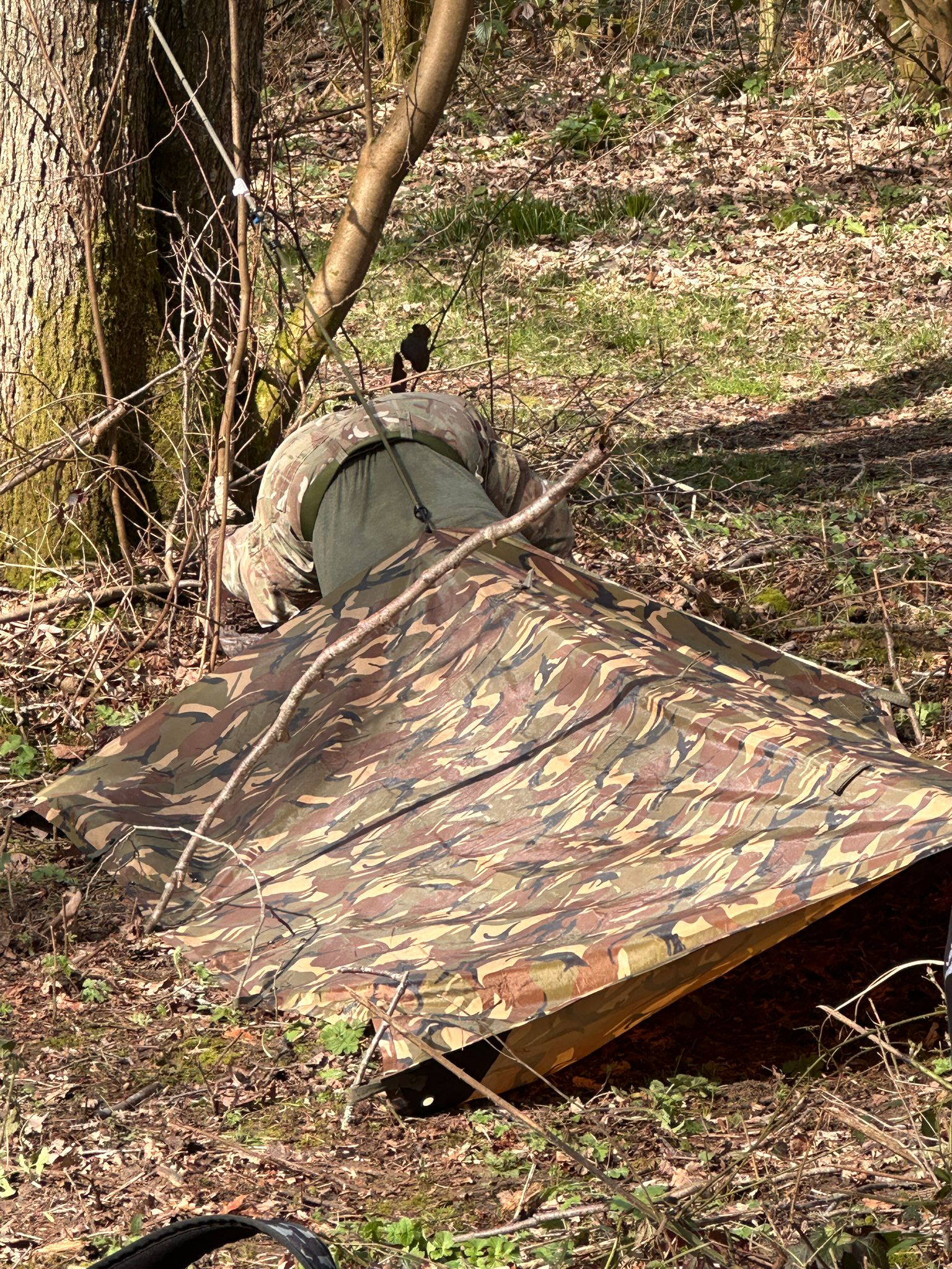To build a basha you will need to locate two trees or saplings a little wider apart than the length of your stasha (a traditional rectangular shaped cover to sleep under to protect you from the elements ) and run a bungee to each from the corner eyelets. Once you have done this pull the stasha back to form a sloping over-cover and stake this out using two tent pegs for the rear eyelets.