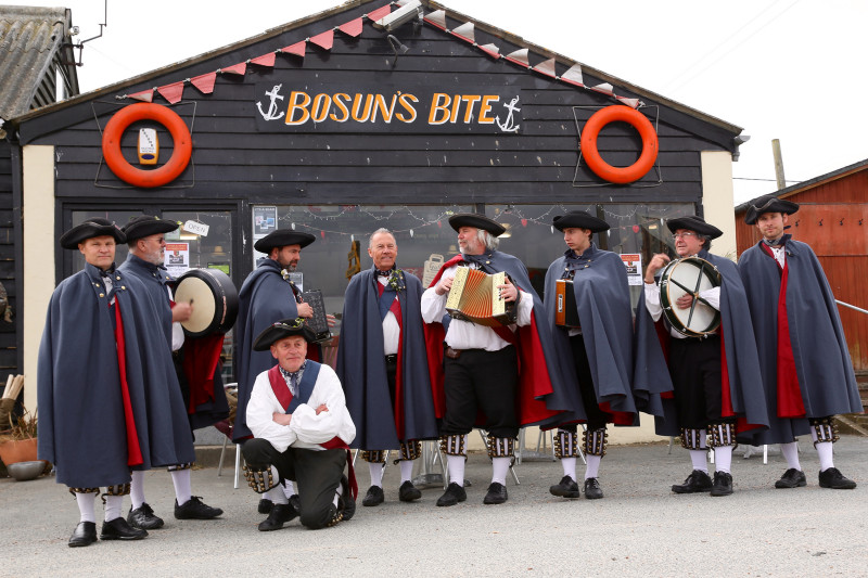 No, not an emergency call at Rye Harbour but the Cinque Ports Morris Men celebrating the ancient tradition of welcoming in the summer on the first of May, writes Martin Bruce. You would have needed to be up with the lark to have caught them “dance up the dawn” at 5.30am  in Smallhythe before moving on to Winchelsea church. After their Rye Harbour frolics (pictured above), the side moved on to Rye for more celebration and dancing. “At least the exercise keeps us warm,” remarked Les Cox on a distinctly chilly morning. Cox once, some years ago, forgot his hat on May Day and always appears without it now, being affectionately known by his colleagues as “Hatless”: a telling detail in what feels a very English tradition of folk celebration. [Photo: Martin Bruce]