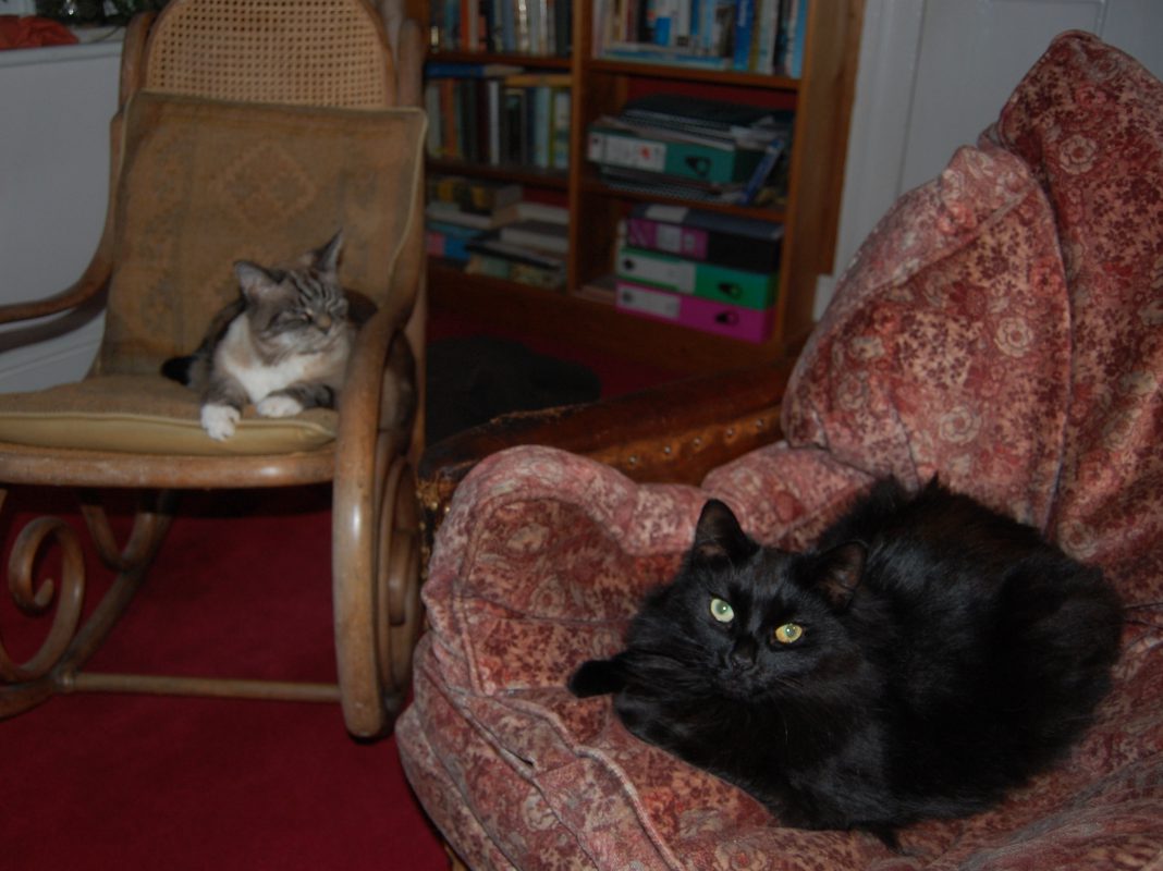 For Mimi is an honourable cat, more like a dog in her habits. She sits in the hall and walks to greet us as we come in the door. She is allowed to sleep on her mistress’s bed (something I don’t altogether approve of). She is loyal and hard-working after her fashion, not pleasure-seeking like feather-headed will o’ the wisp Milly.