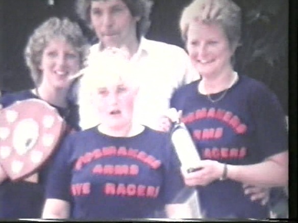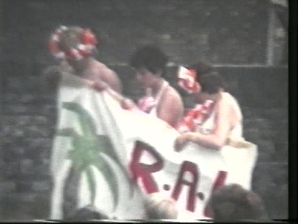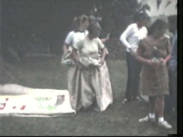 In 1983 a silly “Hop along sackety race” started from the Ypres garden at Sunday noon and a large hop sack supplied by John Jempsons transport had three silly people in it. Entering the race as well were three scantily dressed lads in ladies underwear, and also a team of two men and one lady in grass skirts who won the fancy dress cup.