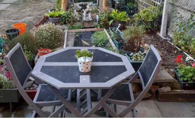 “Hosepipe ban, not at this house. Take one water feature pump and put it in the bath. Attach an old hosepipe to the pump. Run the pipe out of the bathroom window and you get all these plants watered plus more. Beats running up and down the stairs in this heat.”