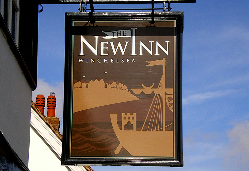 Its main pub, the New Inn, is so named to commemorate the new pub in the new town built in 1288. It was first licensed in the 18th century when it was a coaching inn on the road from Hastings to Rye. It was rebuilt in 1722 and its recent sign depicted a section of the street plan. However, this historically themed sign has recently been replaced with another.