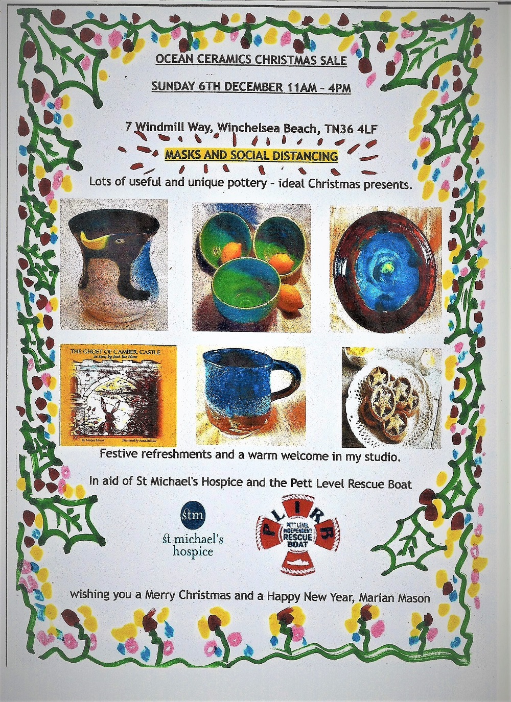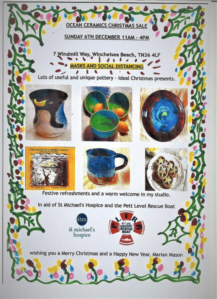 Marian Mason at Ocean Ceramics (see earlier feature), will be running a Christmas sale on Sunday, December 6 at her studios at 7 Windmill Way, Winchelsea beach, from 11am to 4pm. A lovely way to buy your Christmas presents. Click on the poster below for details.