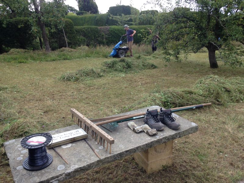 A team of female and male gardeners, armed with a mower, rakes and other suitable implements, set to cut down and rake together the knapweed and grasses, the birds foot trefoil and the rattle, so their seeds will spread and grow. There is a colony of orchids spreading, the camassias will flower again in May. The vista that is then left for the autumn and winter is indeed totally different, and really the only way to demonstrate it is through the pictures.