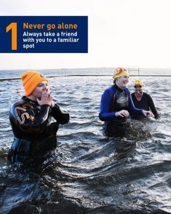 Be prepared – Check the weather forecast, including tide information and wave height. Take plenty of warm clothes for before and after your dip, along with a hot drink for when you come out of the water. Take a mobile phone in a waterproof pouch. Wearing a wetsuit will help increase your buoyancy and reduce the chances of suffering cold water shock