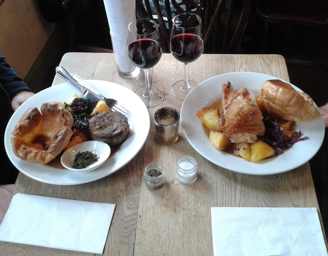 A majestic batter (of Yorkshire Pudding) towers over the plate as the waiter arrives at the table, set under beautifully carved beams and near an open fire (when temperatures justify this) in the historic building, recently restored with great affection.