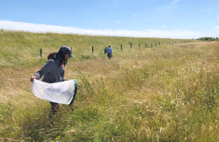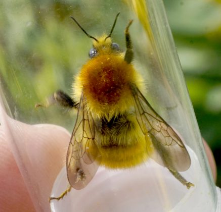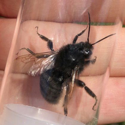 This July, Morgan and Peter led several bumblebee courses and walks on the reserve. During the walks, members of the group had the chance to practice netting and potting a bee for close inspection and identification. “The netting process doesn’t really bother the bees,” Peter explained. “They are tough, armour-covered insects so the soft net doesn’t hurt them and they are only in the pot for a minute or so while they are identified. We’re very careful never to keep a bee in a pot for any longer than five minutes as they might begin to overheat. In fact most bees are so unaffected by the experience that they often go straight back to feeding. Some might even take a rest on your finger before flying off.”