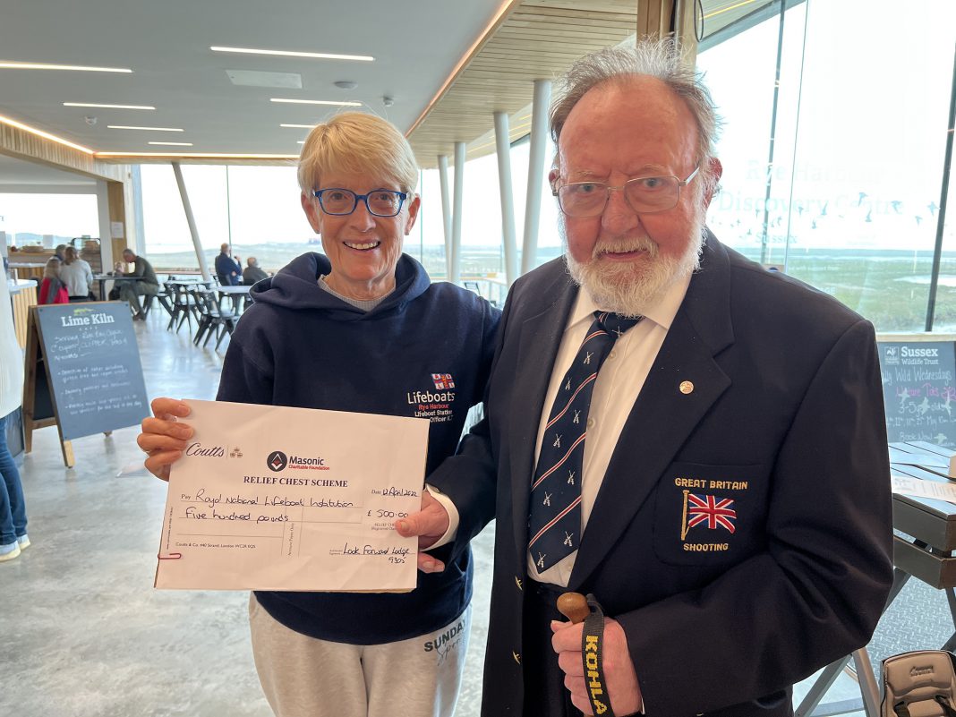 Brian Cornish, past master of the Look Forward Lodge, presented a cheque to Kt Bruce, press officer for RNLI Rye Harbour. It was a fabulous donation of £500 from the Look Forward Lodge 9305, Bisley in Surrey to help towards keeping their crews well trained.