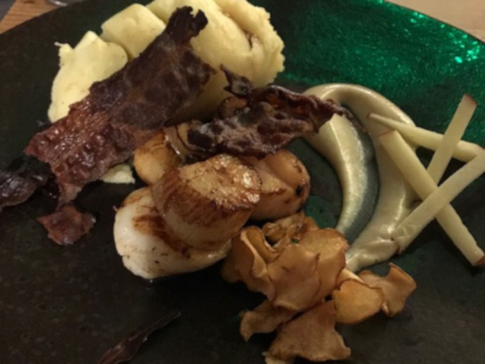 Scallops must be tender and juicy as they will toughen very quickly if cooked for too long. Ours were pan seared and absolutely perfect with a gorgeous melt in the mouth quality. Bacon with scallops has to be crispy. We had two rashers each cooked to the point where they were almost cremated but not quite.