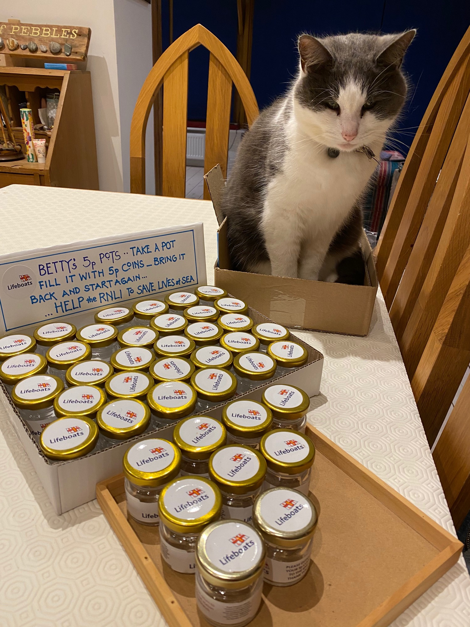 RNLI Rye Harbour fundraising team has embraced the task of raising funds by distributing Betty’s 5p pots