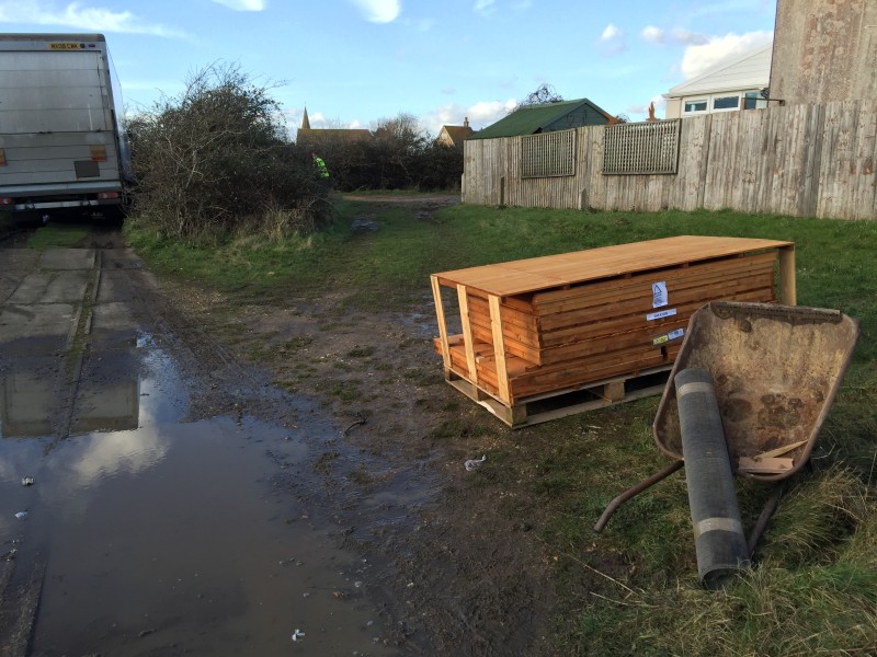The shed pile eventually disappeared from the verge on the lane and re-emerged in no particular order in my plot where it waited for assembly by, back from Qatar for the half term holidays, my husband. [To be continued]
