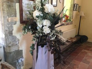 In the more metaphysical field, there was the “Spirit of Freedom” by Elizabeth Wood on the British Legion memorial, and “Cloudscapes” adorned the pulpit. Rainclouds by Alex Boatwright Smith hung from the ceiling, complete with raindrops and there were three more arrangements hanging from the lights. Rainbows popped up, one by Diane Gilchrist  and another in the squint window, and the overall informal  aspect was just so right for a country church.