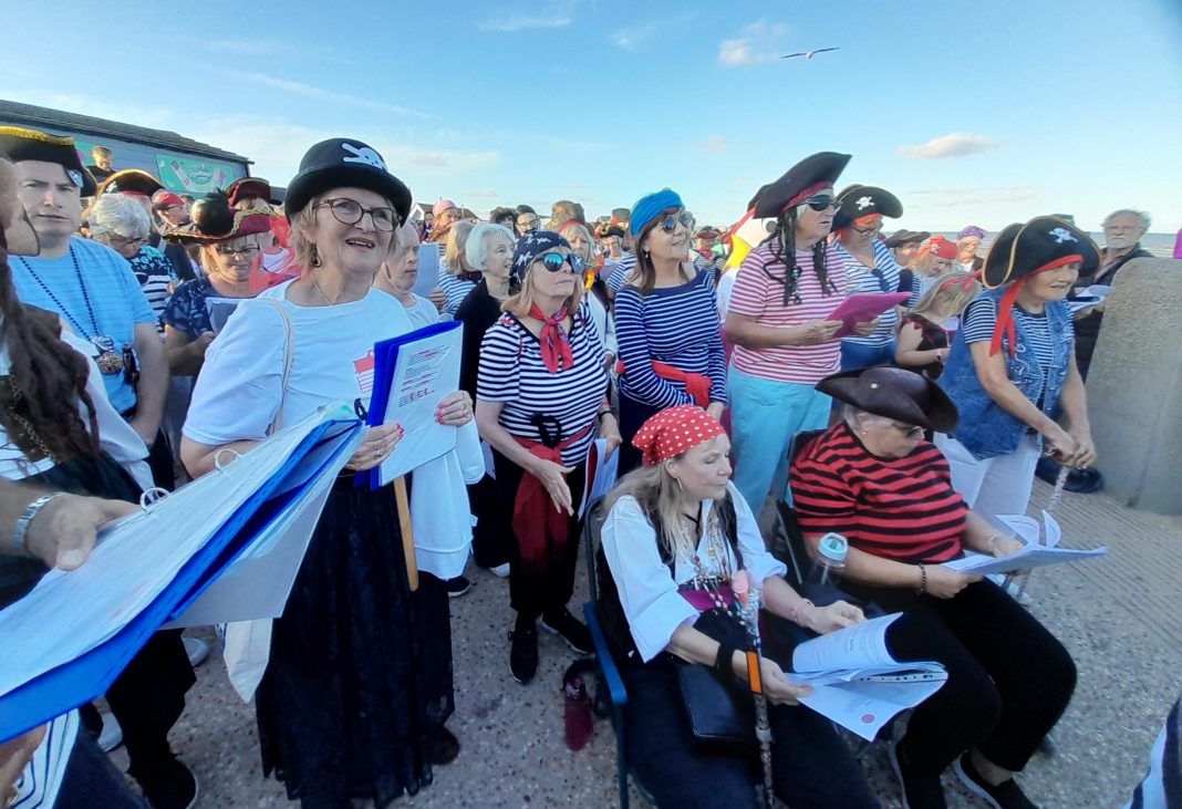 On Saturday, August 27 the Marsh Choir, made up of singers from Rye, Lydd and other parts of the Marsh, were invited to join the Dr Syn Festival in Dymchurch which usually happens every two years but was interrupted by Covid. It started in 2014 as a multi- faceted cultural festival, bringing together the community for music, cinema, theatre and visual arts. Most people stepped up to expectation and had dressed up as pirates/smugglers, a fun and wonderful sight of inspiration, and we were overlooking the sea, the beach and the sun was out.