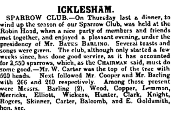 In the latest Beer and Skittles series about local pubs, I’m taking a look at the Robin Hood public house in Icklesham where, in the late 19th century they ran a “sparrow club”. At that time sparrows were considered a nuisance and were shot for sport and sparrow pie. Sparrow clubs offered prizes such as watches, clocks, stuffed birds in glass cases, firkins of ale and the like.BEERTOP