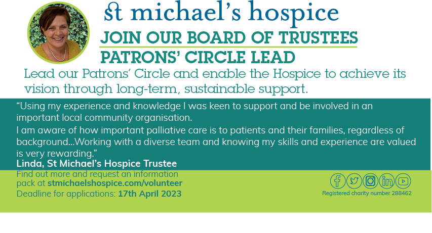 Joining a board of ten existing trustees, the patrons’ circle lead will work alongside St Michael’s’ income generation director to build trusted and valued relationships with the Hospice’s current patrons and foster relationships to generate new patrons.