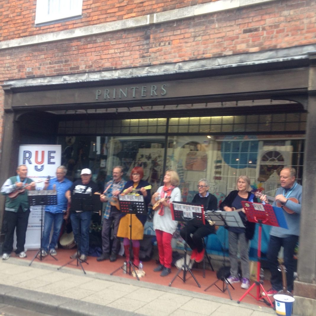 The Rye Ukulele Experiment cheered up the High Street on the opening day of the Rye Arts Festival, writes Gillian Roder, playing outside Adams, as part of the many events that were taking place on this first day. An appreciative audience got in the way of various irritated motorists, as the strumming attracted attention, smiles and fun in spite of the spectators having to dice with parked cars and oncoming traffic.