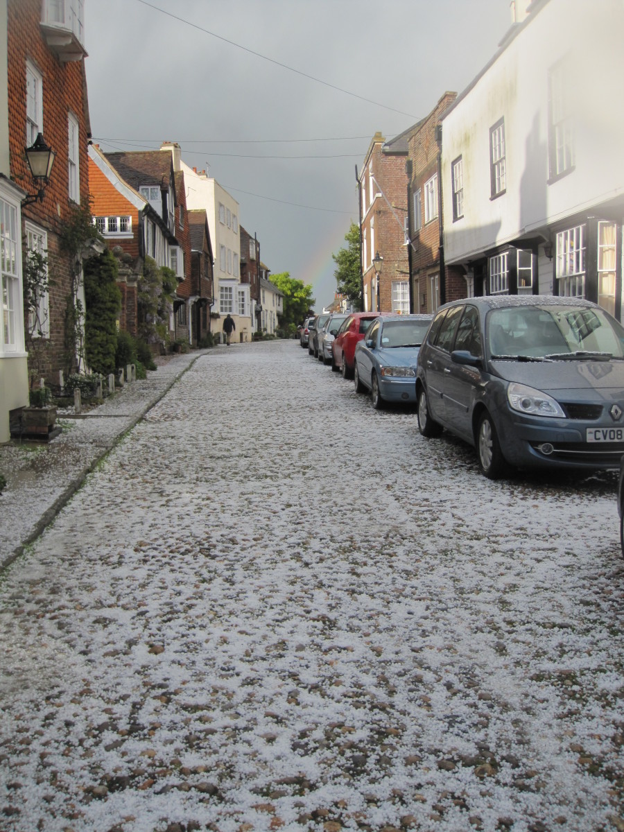 To the sound of thunder, a sudden late afternoon hailstorm this week sent people scurrying home, writes Kenneth Bird. Hailstones more than one centimetre in size rattled down in the space of half an hour, creating an apparent wintry scene in May in one of Rye’s historic cobbled streets. And the storm ended as quickly as it had begun. Family cats emerged from their hiding places, and normal life resumed. Incredibly, tender plants and seedlings in the garden seemed quite undamaged. Photo by John Griffiths.
