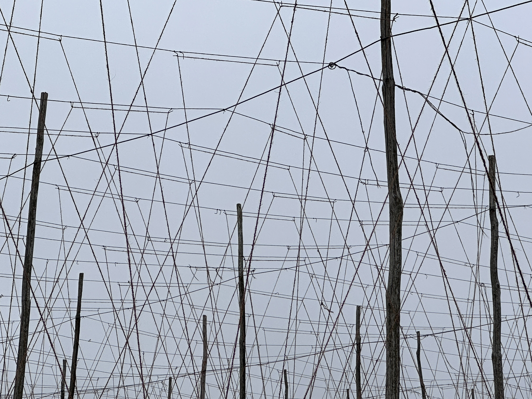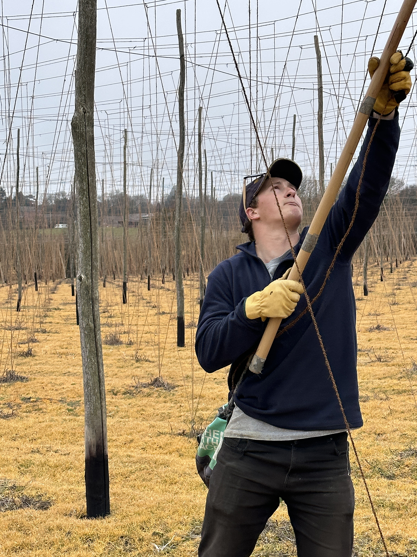 It is the season of hop stringing at Tibbs Farm at the moment and Phil Wheeler learnt the art three years ago. This involves working along the rows adding strings to the overhead wire work for each plant, up which the hop bines can grow. Each will have a staggered “V” of strings, four per plant. The string goes between the screw peg in the ground and the hook on the top of the wirework 14ft above, to create the hop-growing framework. The plants grow on coconut coir string as its rough texture is ideal for the hops to cling to. A good ‘stringer’ may thread up to twenty km of string in a day in this fashion using several hundred kilometres of string a year. The video below will give a glimpse of the technique used.